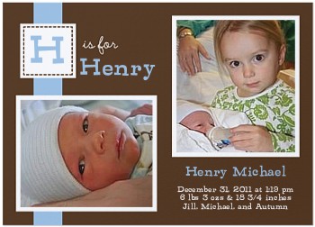 Shutterfly keeps all "projects" you have ever made in your account so you can go back and reorder with ease. While making Henry's birth announcement I stumbled upon Autumn's birth announcement from three years ago. Unfortunately the card design has been discontinued but you can still view your project and copy the image URL. The similarities between our two babies is startling... I wonder if the resemblances will continue as Henry grows...